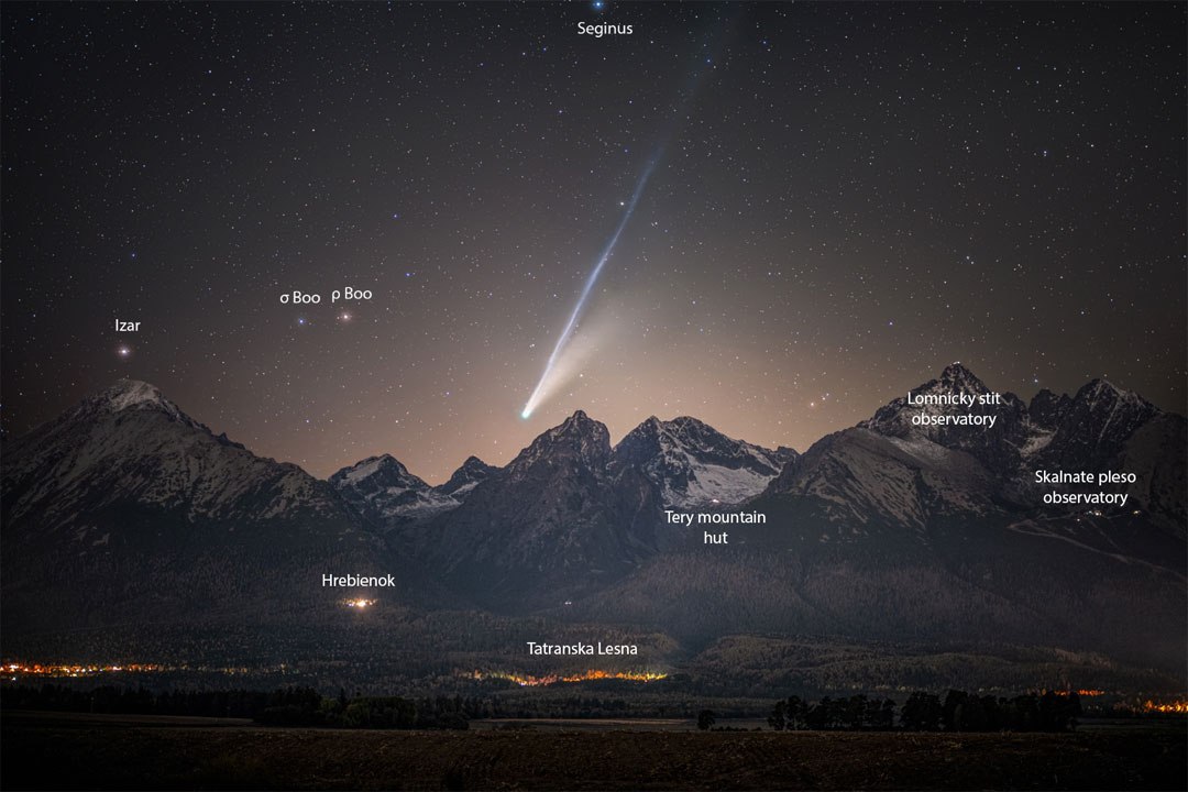 Lemmon kuyruklu yıldızı, dünyanın dört bir yanındaki kameralar için bir gösteri sergiliyor. Bu hafta Dünya’ya en yakın noktasından geçen fotojenik kuyruklu yıldız C/2025 A6 (Lemmon), şu anda iki adet uzun kuyruğu var: mavi bir iyon kuyruğu ve beyaz bir toz kuyruğu. İyon kuyruğu, sürekli değişen güneş rüzgarı tarafından Güneş’ten uzaklaştırılıyor ve herhangi bir anda ne kadar gazın fırlatıldığına bağlı olarak da bir yapı oluşturuyor. Yüksek enerjili güneş ışığı tarafından iyonize edildiği için parlıyor. Toz kuyruğu, güneş ışığı tarafından kuyruklu yıldızdan uzaklaştırılıyor ve güneş ışığını yansıtarak parlıyor. Öne çıkan görüntü, iki gün önce Slovakya’nın Mlynica kentinden çekilen 50 pozlamanın birleştirilmesiyle oluşturulmuş bir kompozit. Ön plandaki dağlar, Slovakya ile Polonya’yı kısmen ayıran Yüksek Tatra Dağları. Lemmon Kuyruklu Yıldızı en iyi uzun pozlamalı fotoğraflarla görülebiliyor olsa da, buz topu gün batımından sonra batıya doğru karanlık gökyüzünde çıplak gözle bile kuzey göklerinden hafifçe görülebiliyor.