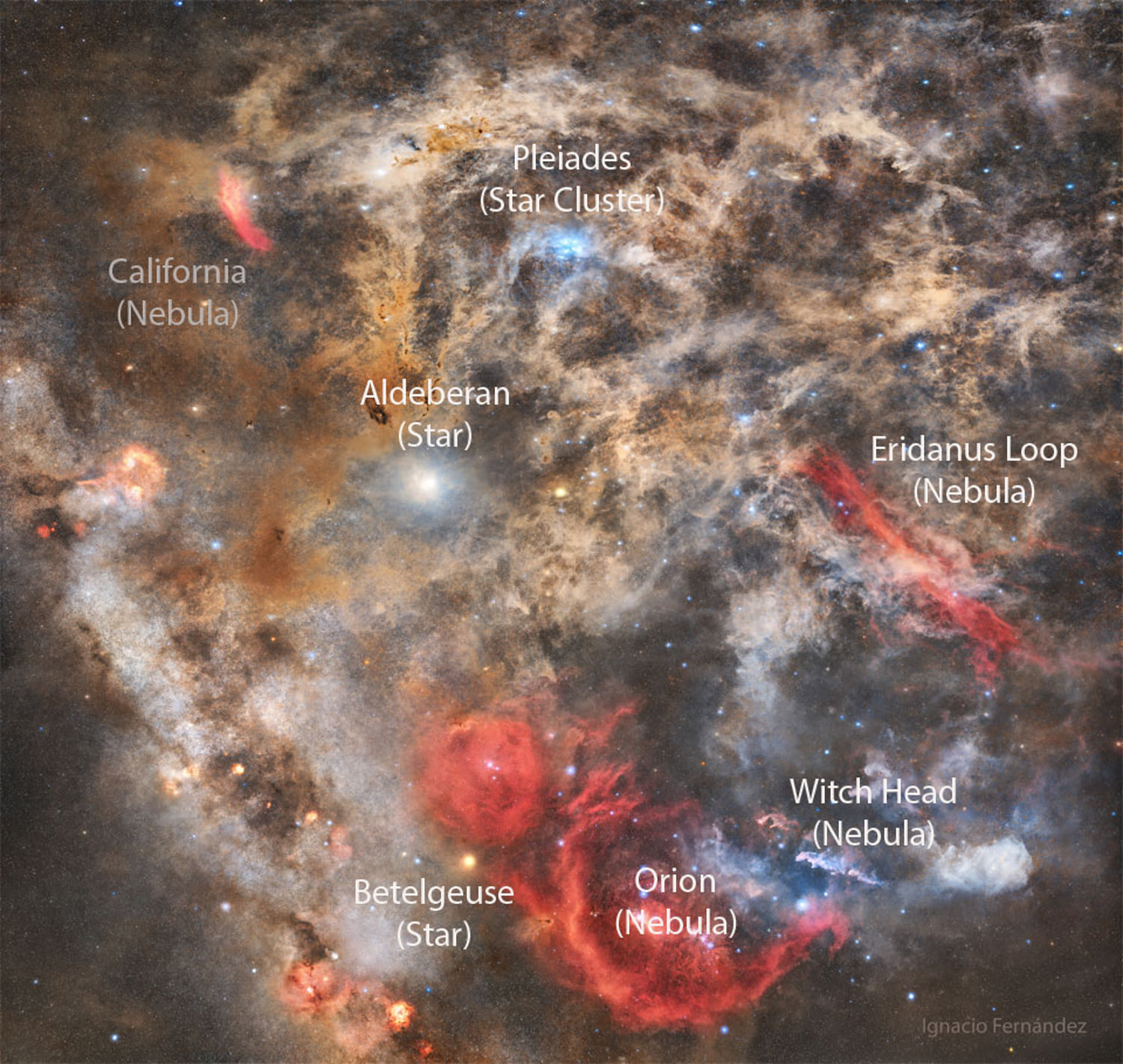 Gece gökyüzünü ne kadar iyi tanıyorsunuz? Peki, çok derin bir görüntüde ünlü gök cisimlerini ne kadar iyi tanımlayabilirsiniz? Her iki durumda da, işte size bir test: Normalde soluk toz ve gaz filamentleriyle dolu derin bir görüntüde, bazı tanınmış gece gökyüzü simgelerini bulabilir misiniz? Bu görüntüde Pleiades Yıldız Kümesi, Barnard İlmiği, Orion Nebulası, Aldebaran, Betelgeuse, Cadı Başı Nebulası, Eridanus İlmiği ve Kaliforniya Nebulası var. Bunların gerçek konumlarını bulmak için, açıklamalı bir görüntü versiyonu da var. Bu görevin zor olmasının nedeni, çok karanlık bir gökyüzünde tanıdık takımyıldızları başlangıçta tanımlamanın zor olmasının nedenine benzer; gece gökyüzümüzün dokusu, son derece gizli ve karmaşık bir yapıya sahip. İspanya’nın Granada kentindeki karanlık gökyüzünde 16 saatlik pozlama ile çekilen kompozit görüntü, bu karmaşıklığın bir kısmını ortaya koyuyor.